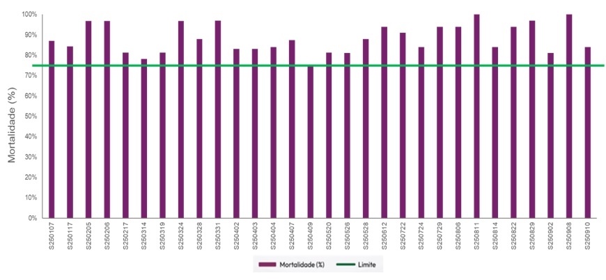 Figura 6. Avaliação de mortalidade de Spodoptera frugiperda (lagarta do cartucho-do-milho) alimentada com dieta tratada com lotes de Baculovírus Sf produzidos no ano de 2025. Faixa na cor verde indica limite de aceitação do produto (70%).