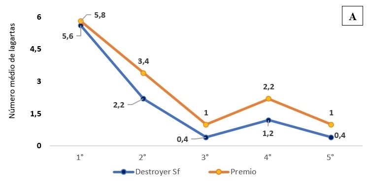 Figura 3. Comparação entre o produto biológico Destroyer Sf e o inseticida Premio quanto à redução do número médio de lagartas de Spodoptera frugiperda até cinco dias após a aplicação.
