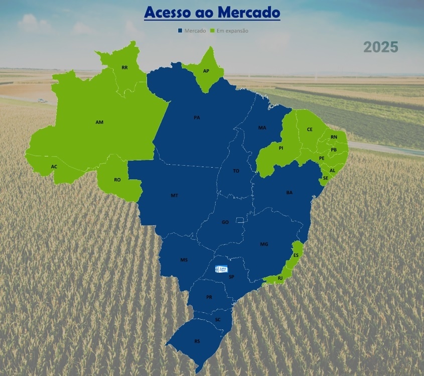Os estados em azul indicam regiões com atuação comercial, enquanto São Paulo destaca-se por abrigar a biofábrica responsável pela produção dos Baculovírus. Os demais estados permanecem como regiões em expansão de mercado, com potencial para futura comercialização. Imagem: Life Biological Control, 2025.