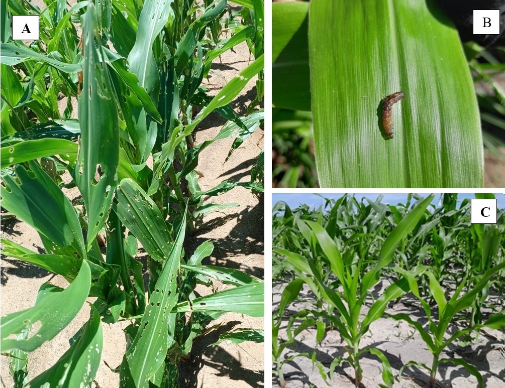 Figura 5. Efeitos da aplicação do Destroyer Sf em Luís Eduardo Magalhães-BA, abril, 2024. (A) Planta sem aplicação do produto, apresentando alto índice de dano por Spodoptera frugiperda. (B) Lagarta morta apresentando sintomas típicos de infecção pelo baculovírus. (C) Planta de milho com excelente recuperação após a aplicação do Destroyer Sf. Imagem: Life Biological Control, 2025.