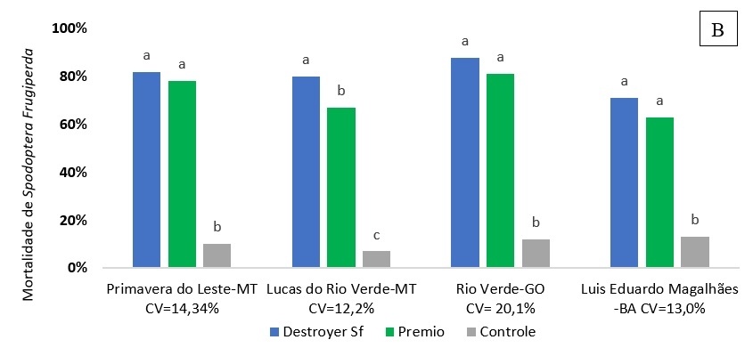 Foi conduzido experimentos a campo para validação da eficácia do Destroyer Sf no controle da lagarta S. frugiperda em diferentes locais do Brasil, evidenciando a capacidade de controle desse produto biológico. O controle de lagartas com o Destroyer Sf foi superior a 80% em Primavera do Leste/MT, Lucas do Rio Verde/MT e Rio Verde/GO, similar ao inseticida Premio para as mesmas localidades. Em Luis Eduardo Magalhães/BA o controle de lagartas com o Destroyer Sf foi superior a 71%, enquanto o inseticida Premio controlou apenas 63% das lagartas existentes na cultura do milho (Figura 4). Na safrinha de 2024 quando esse experimento foi implantado houve uma ocorrência severa de lagartas de S. frugiperda em Luis Eduardo Magalhães/BA devido as altas temperaturas e baixa ocorrência de chuva, associada a disponibilidade de alimento e alta capacidade reprodutiva desse inseto, demonstrando que o Baculovírus Destroyer Sf tem capacidade de controlar essa espécie mesmo em condições de alta infestação.