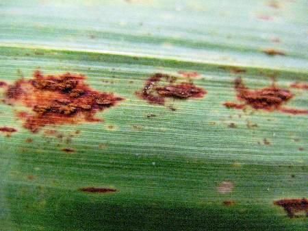 Sintomas: Pústulas na página inferior das folhas são amareladas a marrom-escuro, medem de 2 a 7 mm de comprimento por 1 mm de largura e mostram a formação de esporos subepidérmicos com ruptura da epiderme para sua liberação. Em variedades muito suscetíveis, as pústulas agrupam-se, formando placas de tecido necrosado. Plantas muito atacadas têm crescimento retardado com folhas queimadas e sem brilho.