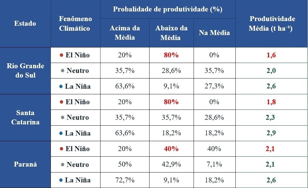 Tabela 2: Impacto do fenômeno ENOS na cultura de aveia na Região Sul do Brasil. Fonte: Dados estaduais de produtividade da aveia de 1996-2025 (CONAB).