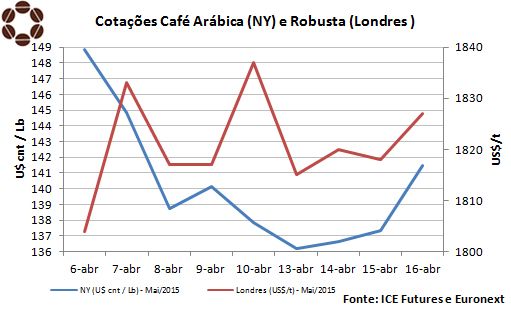 Na ICE Futures US, o vencimento maio do Contrato C foi cotado, ontem, a US$ 141,50 por libra-peso, acumulando alta de 365 pontos em relação ao desempenho da sexta-feira passada. Já na ICE Futures Europe, as cotações do robusta acumularam discreta queda. Ontem, o vencimento maio/2015 encerrou o pregão a US$ 1.827 por tonelada, com perdas de US$ 10 na semana.