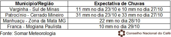 CENÁRIO CLIMÁTICO — A Somar Meteorologia informou que deve predominar tempo aberto nas áreas produtoras de café, já que uma massa de ar seco e um padrão de bloqueio reduzem a probabilidade de chuvas significativas. O quadro abaixo resume a previsão de precipitações da empresa para os próximos 30 dias, por região produtora de Minas Gerais e São Paulo. Nota-se que o cenário ainda não é favorável à recuperação dos cafezais, debilitados pelo prolongado déficit hídrico.