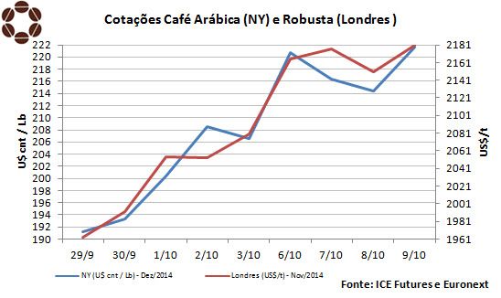 MERCADO — Sem previsão de chuvas significativas sobre as regiões produtoras brasileiras no curto prazo, os preços futuros do café arábica voltaram a disparar nesta semana. Na quinta-feira, o vencimento dezembro do Contrato C, negociado na Bolsa de Nova York, valorizou-se em 3,36%, encerrando a sessão a US$ 2,2165 por libra-peso, o maior valor de fechamento observado desde 20 de janeiro de 2012. Assim, a posição acumulou ganhos de 1.515 pontos na semana.