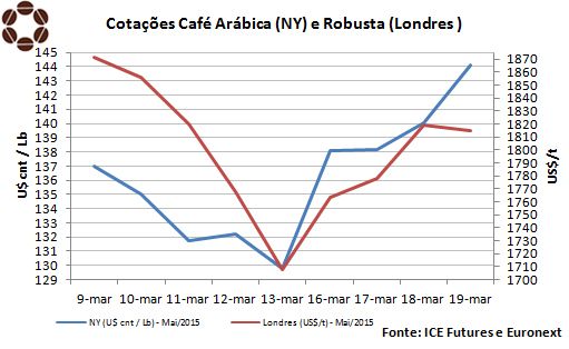 Na ICE Futures US, o vencimento maio do Contrato C foi cotado, na quinta-feira, a US$ 1,4415 por libra-peso, acumulando alta de 1.435 pontos em relação ao final da semana passada. Na ICE Futures Europe, as cotações do robusta também apresentaram recuperação. Ontem, o vencimento maio/2015 encerrou o pregão a US$ 1.815 por tonelada, com ganhos de US$ 107 desde o final da semana anterior.