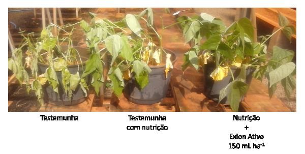Figura 1. Resposta ao estresse hídrigo por plantas de feijão com aplicação de ácido salicílico (Exion Ative). Foto: Kimberlit Agrociências.