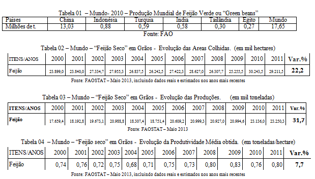 Contudo, neste diagnostico, iremos separar melhor em duas formas mais conhecidas e com mais dados confiáveis: 1) feijão seco (“dry beans”) - o mais cultivado e consumido no Mundo, sendo a maioria do gênero “phaseolus”; 2) feijão verde (“green beans” ou “wet beans”), consumido ainda na vagem ou após a sua debulhagem e o mais produzido e consumido na China e também em parte do Brasil onde é chamado de macassar (lembrando que as estatísticas brasileiras somam apenas estes dois tipos) e também de “fava” ou “feijão-fava” (embora uma outra espécie, mas que também é um feijão comestível).