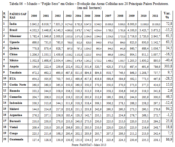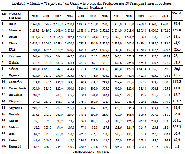 A Índia liderou a Produção Mundial de Feijão Seco em 2011, seguida por Mianmar e com o Brasil em terceiro lugar e a China em quarto. A Produção em Mianmar vem ampliando bastante a cada ano e no Brasil está lenta.