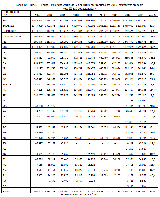 O Valor Bruto da Produção de Feijão ampliou muito entre 2005 e 2013 mais em função dos melhores preços de venda alcançados do que de incrementos da produção (que na verdade reduziu muito após 2011). Em 2013, O VBP deve alcançar R$ 8,4 bilhões, liderado pelo Sul, Sudeste e Nordeste. Notem que PR (feijão de sequeiro), MG (feijão de sequeiro + feijão irrigado) e GO (feijão irrigado) lideram no Centro Sul e BA (feijão de sequeiro + feijão irrigado) e CE (feijão de sequeiro do tipo macassar) no Nordeste.