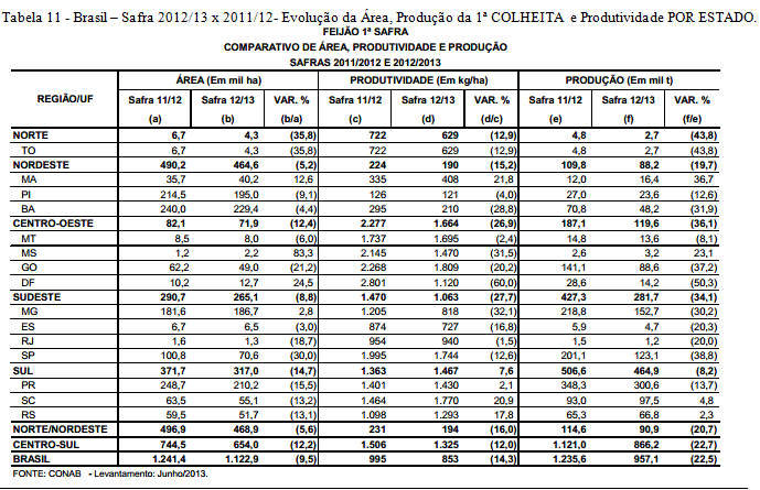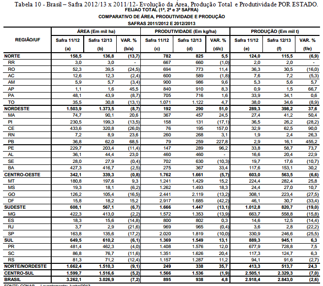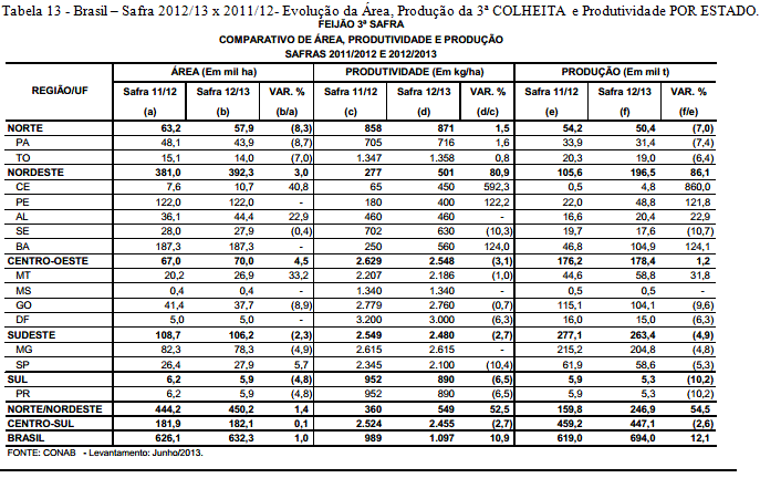 Pior é que a segunda colheita 2012/13 (ora em cultivo/colheita e mais no PR, MG, SP, MT, GO e Nordeste) e a terceira colheita (ainda a plantar e de forma irrigada no Centro-Oeste, Sudeste e Bahia) não devem reagir como se contava, sendo que, a cada mês, a CONAB reduz as previsões de suas colheitas. Como é uma cultura de ciclo muito rápido, em geral, os elevados preços de venda de uma colheita muito incentivam o plantio da colheita seguinte na mesma safra, isto é, compensando e mantendo a oferta quase constante, mas o que não ocorrerá nesta Safra. A primeira colheita 2012/13 (no Sul e Sudeste) já foi realizada e é a que está no mercado, mas com preços em forte elevação, pois ela teve redução de -20,3% ante o volume colhido em mesma época da Safra 2011/12.