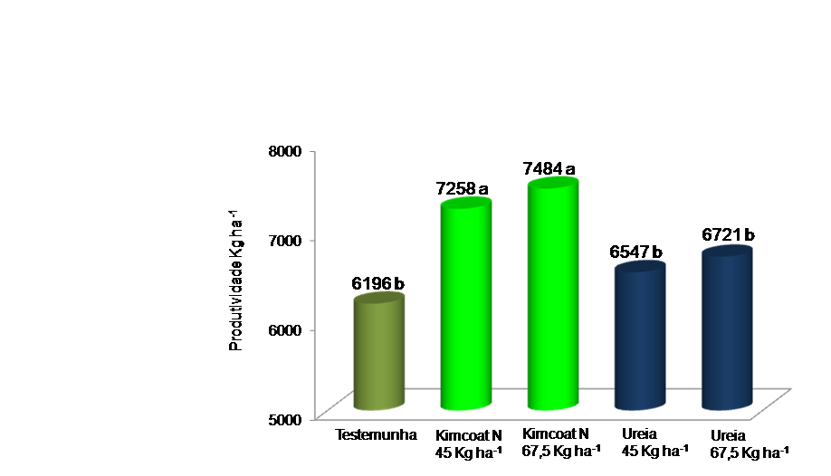 Exemplificando os inúmeros e constantes resultados positivos do uso da tecnologia Kimcoat, cita-se abaixo (Figura 3) a resposta da cultura do milho submetida a 3 doses de nitrogênio (0, 45 e 67,5 kg ha-1) e duas fontes deste elemento, a ureia e o Kimcoat N (ureia revestida com polímeros). Quando se compara os resultados, observa-se que o milho apresentou produtividade superior com a tecnologia de revestimento, fazendo jus aos benefícios proporcionados por esta técnica. Estes resultados vêm de encontro com a necessidade socioambiental global, caracterizada pelo aumento da eficiência do uso dos fertilizantes.