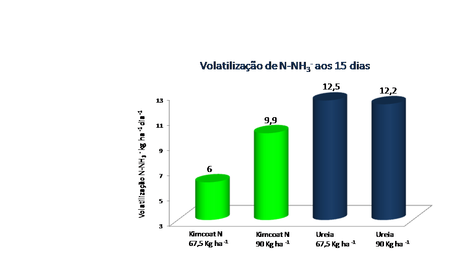 O processo de perda por volatilização de amônia consiste na passagem da amônia presente no solo à atmosfera (Diest, 1988), conforme a seguinte relação: NH4+ + OH- (aquoso) → H2O + NH3- (gás). O NH3- perdido por volatilização será proveniente da mineralização da matéria orgânica ou do fertilizante aplicado, sendo esse o fenômeno mais intenso mediante aumento no pH do solo (Melo, 1978). A volatilização de amônia é um processo rápido que ocorre na semana seguinte da aplicação de N (Diest, 1988). A ureia aplicada é rapidamente hidrolisada em dois ou três dias (Byrnes, 2000). Assim, quando a ureia é aplicada ao solo, o processo de perda N-NH3- por volatilização envolve inicialmente a hidrólise por meio da urease, que é uma enzima extracelular produzida por bactérias, actinomicetos e fungos do solo ou, ainda, originada de restos vegetais (palhada). As perdas podem chegar a 80 % em situações mais extremas, como no caso da adubação de cobertura para culturas como arroz, cana-de-açúcar, citros e milho. A tecnologia Kimcoat N atua na diminuição da atividade da urease, enzima responsável pela quebra da ureia à amônia NH3- como pode ser observado na Figura 1, reduzindo as perdas de N.