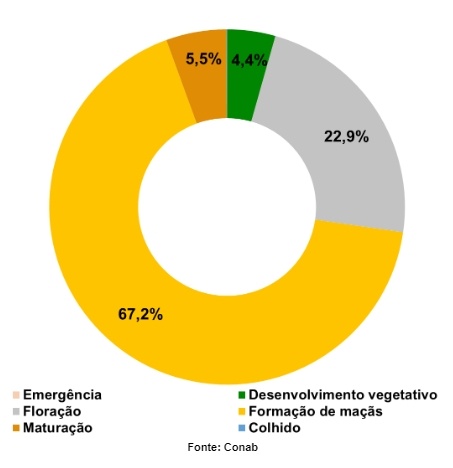 Na Bahia, as lavouras apresentam boas condições de desenvolvimento, graças às boas condições climáticas. As lavouras estão principalmente em formação de maçãs. Em Goiás, as lavouras também apresentam boas condições de desenvolvimento, principalmente na região Sudoeste, onde grande parte das lavouras está em início de formação de maçãs.