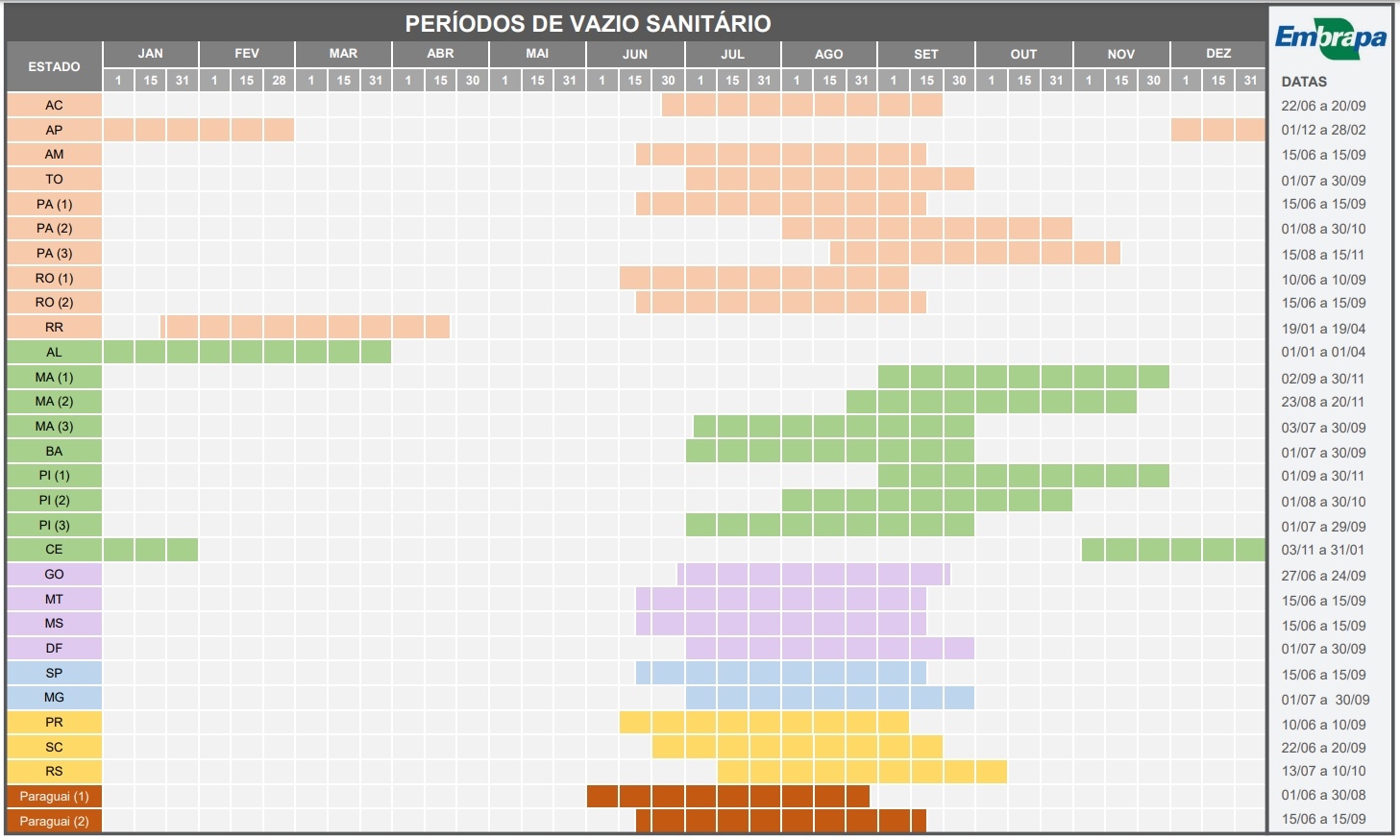 Em junho e julho, tem início o vazio sanitário da soja nos maiores estados produtores de soja: Paraná (10 de junho), Mato Grosso (15 de junho), Goiás (15 de junho) e Rio Grande do Sul (13 de julho). Em 2021, o Ministério da Agricultura, Pecuária e Abastecimento (Mapa) publicou a Portaria nº 388, de 31 de agosto de 2021, que estabelece o vazio sanitário, como medida para o controle do fungo Phakopsora pachyrhizi, causador da ferrugem-asiática da soja, e o calendário de semeadura, como medida fitossanitária para racionalização do número de aplicações de fungicidas.
