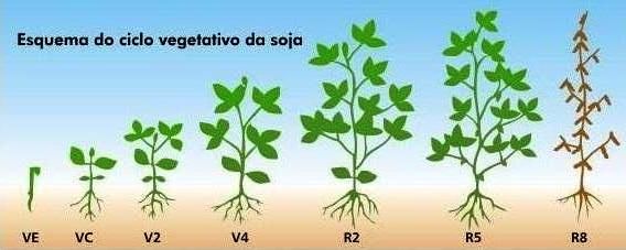 O sistema de representação empregado aqui divide o desenvolvimento da planta em duas fases: vegetativa (V) e reprodutiva (R). Subdivisões da fase vegetativa são designadas numericamente como V1, V2, V3, até Vn, menos os dois primeiros estádios que são designados como VE (emergência) e VC (estádio de cotilédone). O último estádio vegetativo é designado como Vn, onde “n” representa o número do último nó vegetativo formado por um cultivar específico. O valor de “n” varia em função das diferenças varietais e ambientais. A fase reprodutiva apresenta oito subdivisões ou estádios.
