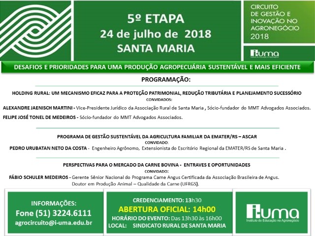 O Presidente do I-UMA (Instituto de Educação no Agronegócio), José Américo da Silva, juntamente com o Diretor Técnico da EMATER/RS, Lino Moura e o Presidente da Associação Rural de Santa Maria, Conrado Hoffmann, têm a satisfação de convidar Vossa Senhoria para a 5ª Etapa do CIRCUITO DE GESTÃO E INOVAÇÃO NO AGRONEGÓCIO, evento que tem como conexão temática, “Os Desafios e Prioridades para uma Produção Agropecuária Sustentável e mais Eficiente” a ser realizado no próximo dia 24 de julho 2018, das 13h30 às 17h00, no Sindicato Rural de Santa Maria.