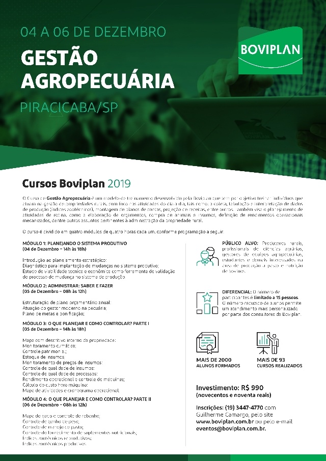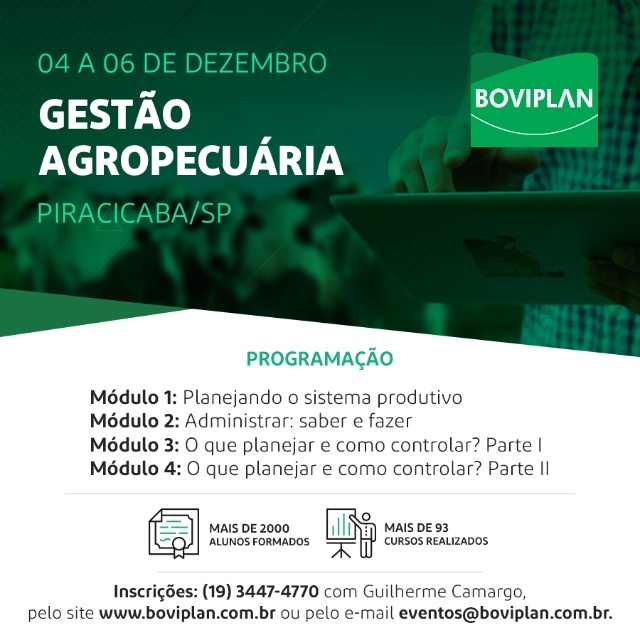 Inscrições: (19) 3447-4770 com Guilherme Camargo, pelo site www.boviplan.com.br ou pelo e-mail [email protected].