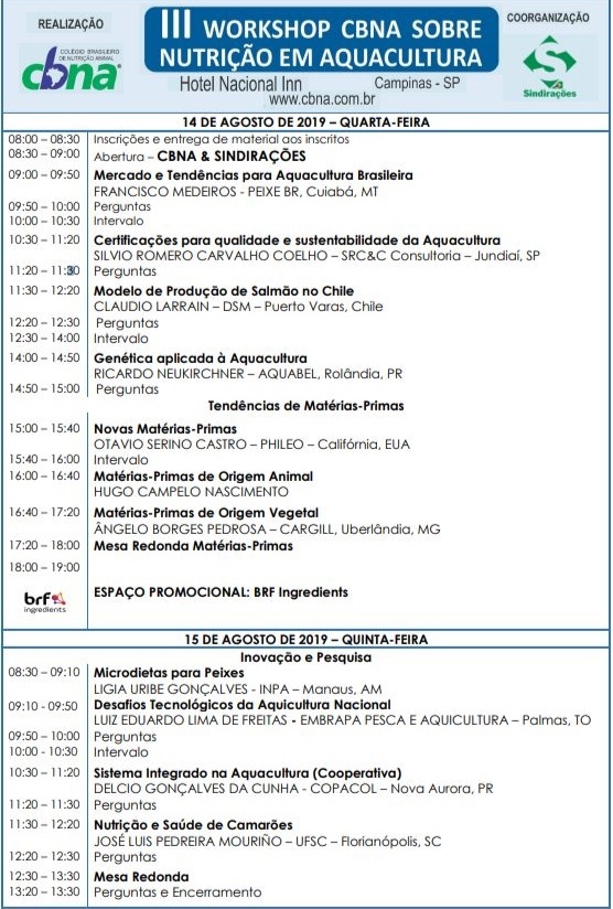 Realizado pelo CBNA, o Colégio Brasileiro de Nutrição Animal, o encontro deve reunir cerca de 200 participantes para debater os principais entraves e oportunidades de um dos setores que mais crescem no país, afirmou o Diretor do CBNA e coordenador do III Workshop CBNA sobre nutrição em aquacultura, Ariovaldo Zani. "O objetivo é contribuir com um debate amplo sobre futuro de um setor que desponta com um dos crescimentos mais relevantes diante da demanda crescente por proteína animal em escala global. As mais recentes pesquisas e inovações para a área também serão discutidas durante estes dois dias de evento", salientou.