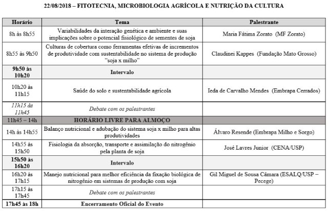 Assumindo a nova diretriz de itinerância do evento, o Simpósio da Cultura da Soja, a partir de 2018, passa a ser oferecido em localidades de ampla representatividade quanto à produção dessa importante oleaginosa, com o objetivo básico e primordial de possibilitar o intercâmbio de ideias e inovações, além da ampliação da rede de network entre os seus participantes, por meio do oferecimento de palestras técnicas, proferidas por reconhecidos profissionais atuantes na cadeia produtiva da soja brasileira.