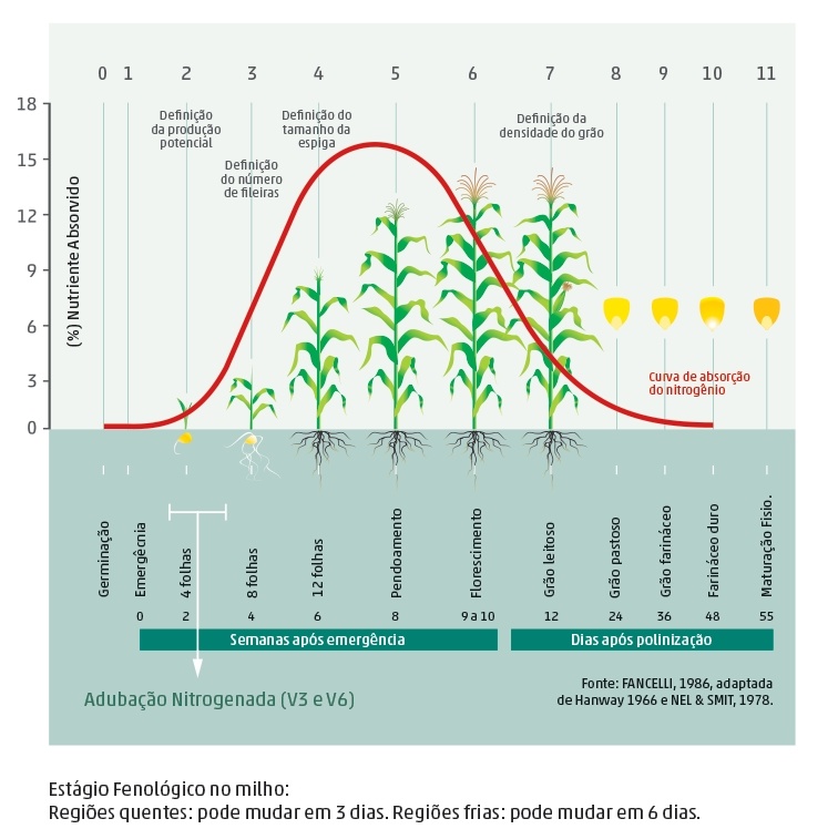 Observa-se na imagem que desde a segunda semana a produção já começa a ser definida. O milho absorve quase 70% do nitrogênio até o florescimento. Assim, recomenda-se a adubação nitrogenada de cobertura geralmente entre V3 a V6, independente da aplicação ser em dose única ou parcelada (chuvas intensas, solos arenosos ou altas doses). Os intervalos podem ser de 15 a 30 dias. Em algumas regiões, o momento de aplicação varia um pouco.