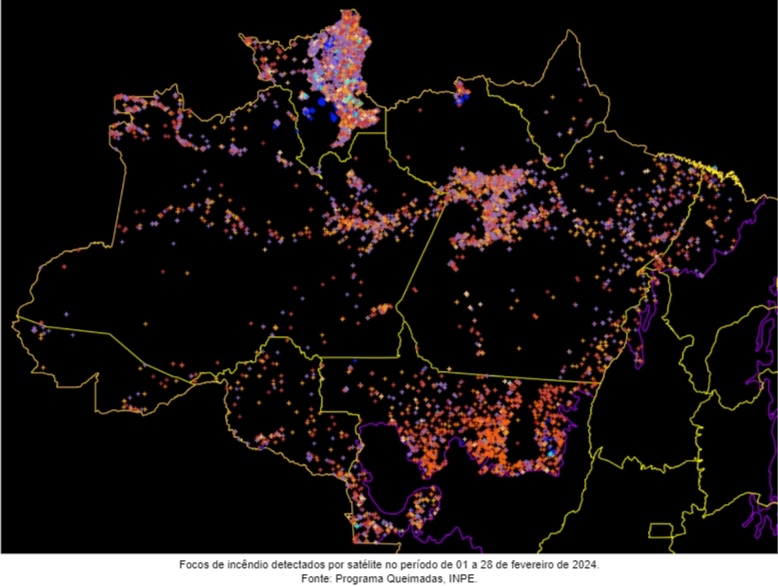 O mês de fevereiro encerrou com recorde de pontos de calor na Amazônia, abrangendo partes de Mato Grosso e Maranhão. Os satélites detectaram 2961 focos de calor, representando um aumento de 68% em relação ao recorde anterior, estabelecido em 2007 com 1761 detecções.