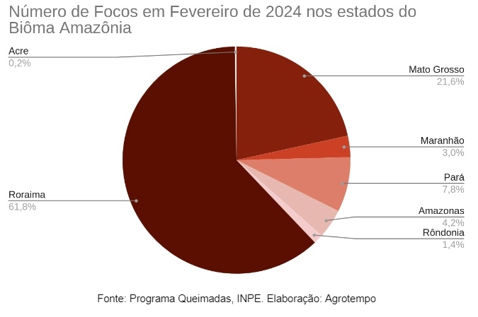 Dos 2961 focos na região, 61,8% são registrados no estado de Roraima, ao passo que 21% são identificados em Mato Grosso. Pará e Amazonas vêm na sequência com 7,8% e 4,2% respectivamente.