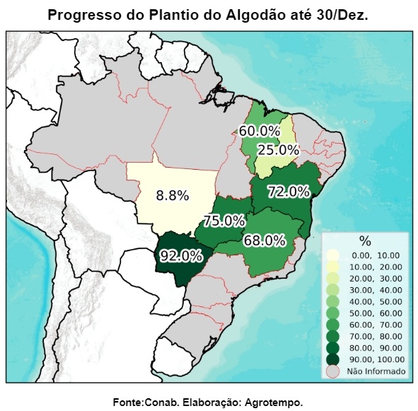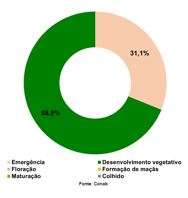 - A Bahia, um dos maiores produtores, manteve um crescimento estável, aumentando de 66% para 72% nesta semana. Comparativamente, está ligeiramente à frente da safra passada, que registrou 71% no mesmo período.