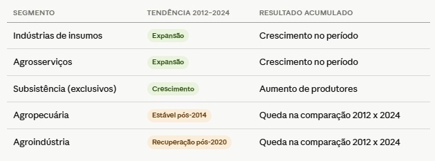 A análise por segmento entre 2012 e 2024 revela comportamentos opostos dentro do próprio agronegócio paulista.