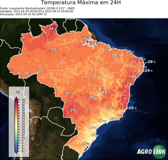 uma grande massa de ar seco, predomina o tempo no centro-sul do país impedindo a formação de nuvens carregadas na região. Já no Norte e Nordeste do país, a condição de pancadas de chuvas é predominante em praticamente todas as áreas.
