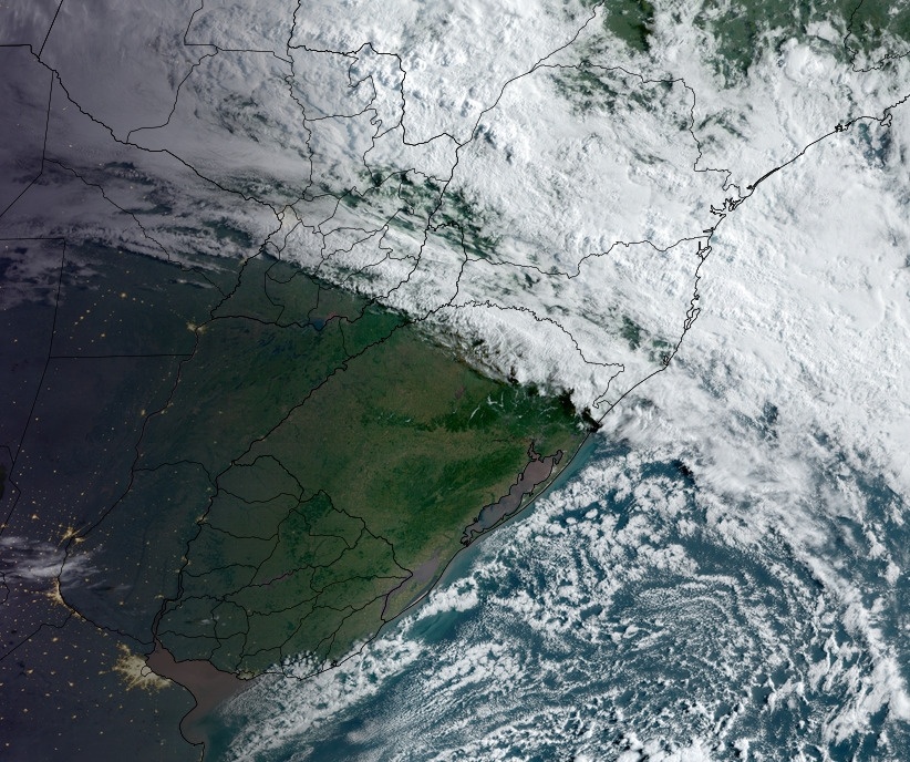 Nas localidades que amanheceram com o tempo limpo, vento calmo e temperaturas inferiores aos 5°C, as condições para formação de geadas são elevadas. E esta condição foi registrada em uma ampla área do estado do Rio Grande Do Sul, como podemos ver na imagem de satélite.