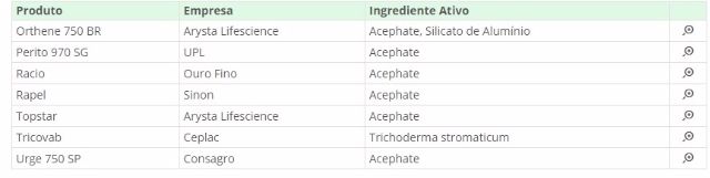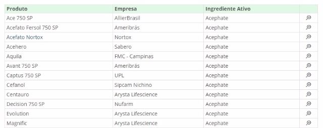 No Brasil, o Acefato está presente como ingrediente ativo de 19 produtos de diversos formuladores, confira: