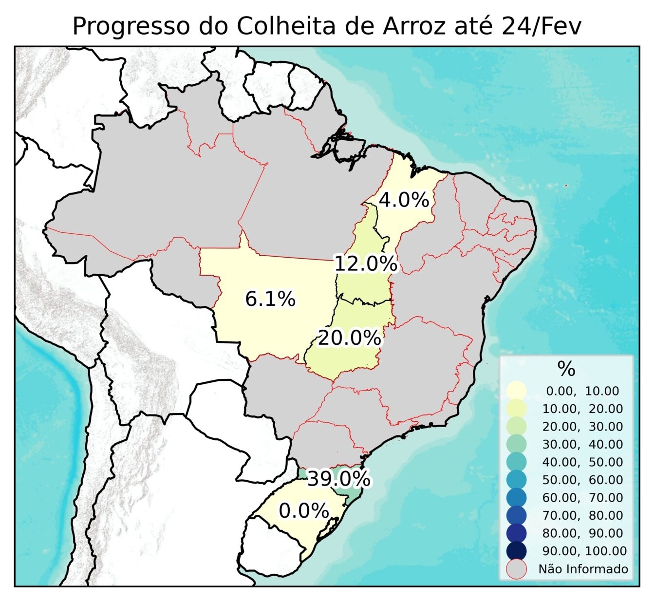 - Rio Grande do Sul: Sem mudança na operação de colheita (sem variação), permanecendo estável em comparação com a safra anterior que também não havia iniciado a colheita neste período.