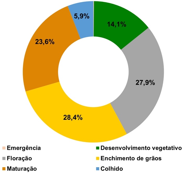 Além disso, grande parte das lavouras estão avançando pela maturação (27,9%) e enchimento de grãos (28,4%), enquanto que apenas 14,1% ainda está nos estádios iniciais do desenvolvimento vegetativo.