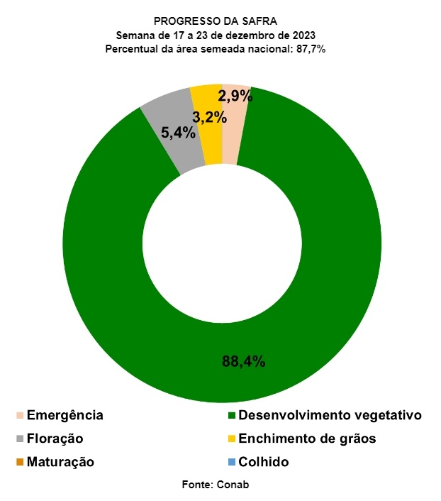 A análise é do meteorologista do Portal Agrolink, Gabriel Rodrigues com revisão de Aline Merladete com informações obtidas no boletim de Progresso de Safra da Companhia Nacional de Abastecimento (Conab)