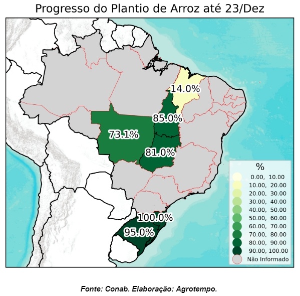 Segundo o mais recente monitoramento das condições das lavouras realizado pela Conab, o avanço da semeadura da safra de arroz no Brasil é destaque em estados do Sul e Centro-Oeste. Na região Sul, as temperaturas mais elevadas e o tempo seco favoreceram o desenvolvimento das lavouras, principalmente para as plantas que iniciam o período reprodutivo.