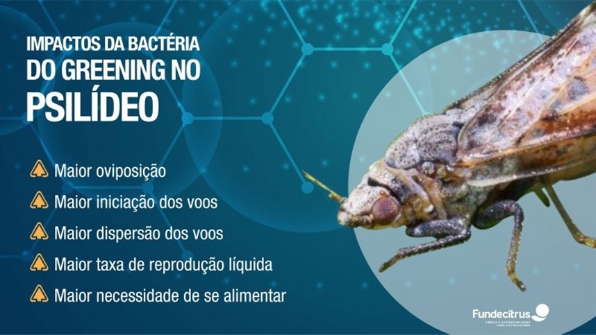 Estudos recentes, incluindo um em parceria entre o Fundecitrus e a Universidade da Califórnia, revelaram que a bactéria do greening (Candidatus Liberibacter asiaticus) provoca alterações fisiológicas no psilídeo, desafiando ainda mais o trabalho de manejo do inseto. Aumento no número de ovos, voos para dispersão mais frequentes e com maiores distâncias, além de mais atratividade ao hospedeiro, são algumas das mudanças observadas no psilídeo contaminado.