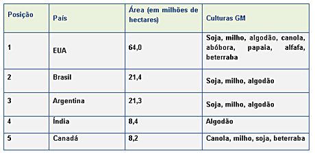 Brasil – O Brasil plantou 21,4 milhões de hectares com culturas GM em 2009, um crescimento de 35,4% em relação a 2008 (equivalente a 5,6 milhões de hectares). O ótimo desempenho levou o País, pela primeira vez, ao segundo lugar no ranking mundial de transgênicos, ultrapassando a Argentina e ficando atrás apenas dos Estados Unidos.