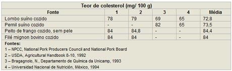 “A pele de frango e a casca do camarão, por exemplo, são riquíssimas em colesterol apesar de não serem normalmente associadas ao risco de colesterol elevado pelos brasileiros. No caso da carne suína, o lombo é corte com menor teor de gordura intramuscular e seu teor de colesterol chega a ser menor do que o do peito de frango sem pele”, salienta o médico veterinário e mestre em Agronegócios Fabiano Coser, diretor executivo da Associação Brasileira dos Criadores de Suínos (ABCS). Confira a comparação: