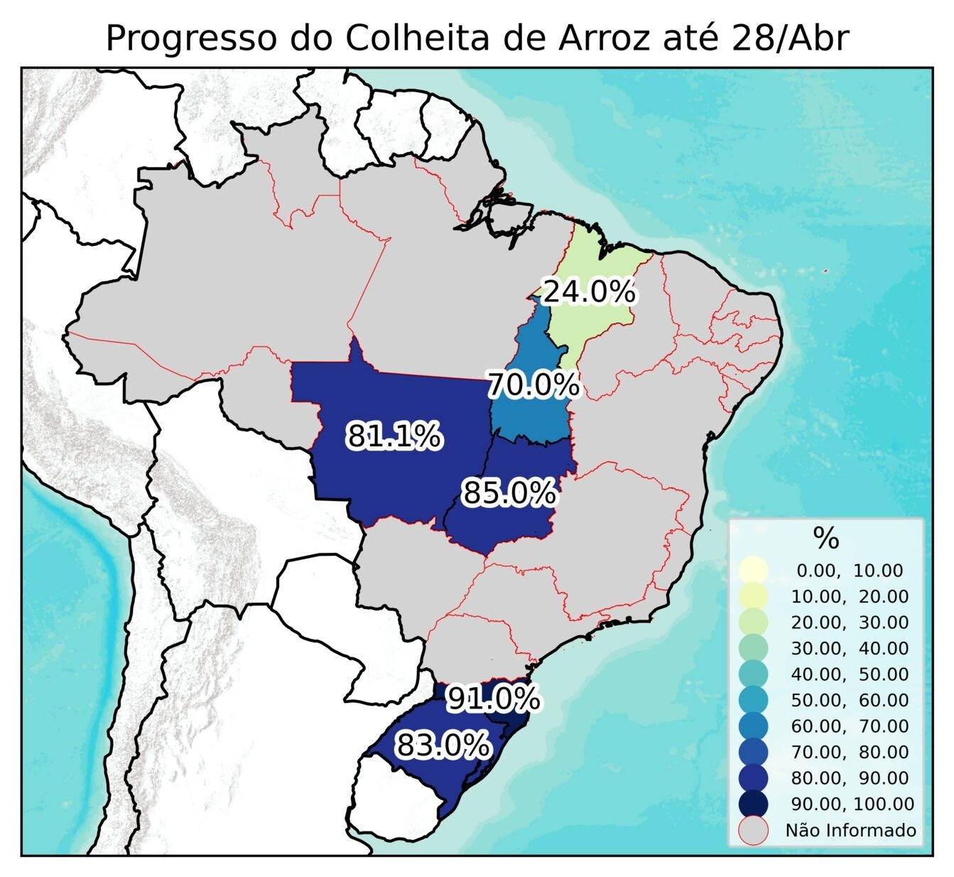 Com pouco mais de 20% das lavouras ainda em campo, a colheita do arroz ocorre conforme as condições climáticas. Desta forma, as áreas do centro-norte do Brasi estão tendo um melhor desempenho, enquanto áreas do sul estão atrasadas, refletindo também no cenário nacional.