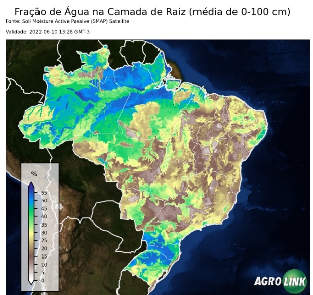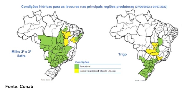 Além disso, a umidade no solo será o suficiente para as lavouras de milho 2ª safra ainda em enchimento de grãos, e para o trigo em desenvolvimento, floração e enchimento de grãos no MS.