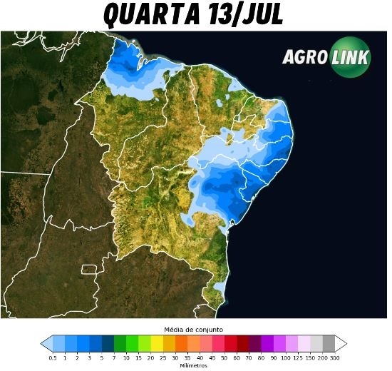 Ao longo desta quarta-feira (13/07), de maneira geral, espera-se uma diminuição das instabilidades sobre a região. Apesar disso, os ventos oceânicos contribuem para a formação de nuvens de chuva sobre o nordeste da Bahia até o leste do Rio Grande do Norte. Nessas áreas são esperados volumes entre os 10 e 15 mm ocorrendo de forma fraca e bem distribuída ao longo do dia.