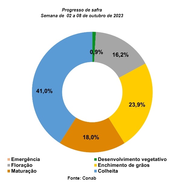 Em Goiás, a colheita foi finalizada, um aumento em relação à semana anterior quando estava em 85%.