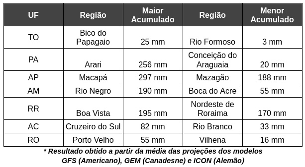 Já em áreas da metade sul da região norte, devem registrar menores volumes de chuva no decorrer da semana, com destaque para o estado do Tocantins, fortemente influenciado pela massa de ar seco que atua no Brasil central.