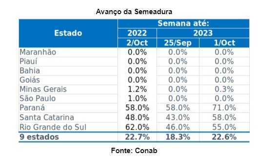 O Paraná, por sua vez, demonstra uma evolução na semeadura, crescendo de 58,0% na safra passada para 71,0% em 1° de outubro.