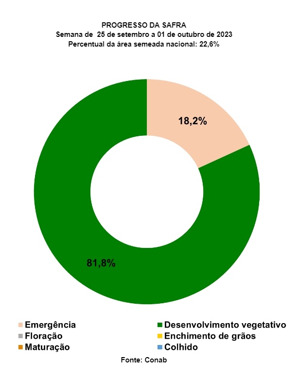 A avaliação nos 9 estados monitorados resulta em um percentual de semeadura de 22,6% em 1° de outubro, praticamente estável quando comparado com a safra passada (22,7%), mas evidenciando um crescimento em relação à semana anterior (18,3%).