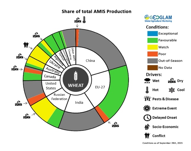 Indicado pelo Monitor Global de Agricultura (GEOGLAM) a colheita de trigo da primavera no hemisfério norte está se aproximando do fim, e os resultados mostram que condições desfavoráveis afetaram significativamente as safras em países como Canadá, Estados Unidos e China. Enquanto isso, no hemisfério sul, condições secas contínuas estão preocupando agricultores na Argentina e Austrália.