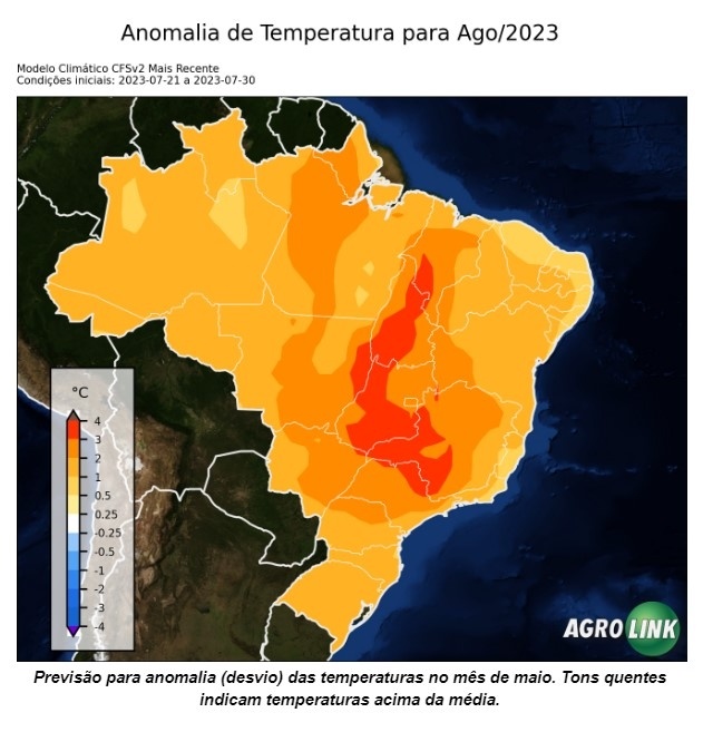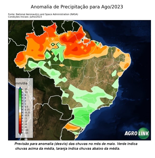 As projeções para o mês de agosto indicam um panorama climático nesta linha do que seria esperado para um período de El Niño. Agosto é considerado fundamental, especialmente se considerarmos que as preparações para a safra de grãos 2023/24 começam a se intensificar.