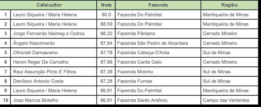 Os 50 melhores lotes foram premiados durante a Semana Internacional do Café. Para ser especial uma café deve atingir pelo menos 80 pontos na escala de avaliação que vai de 0 a 100, segundo a Specialty Coffee Association (SCA). Os dez primeiros colocados atingiram notas acima de 86.8 pontos.